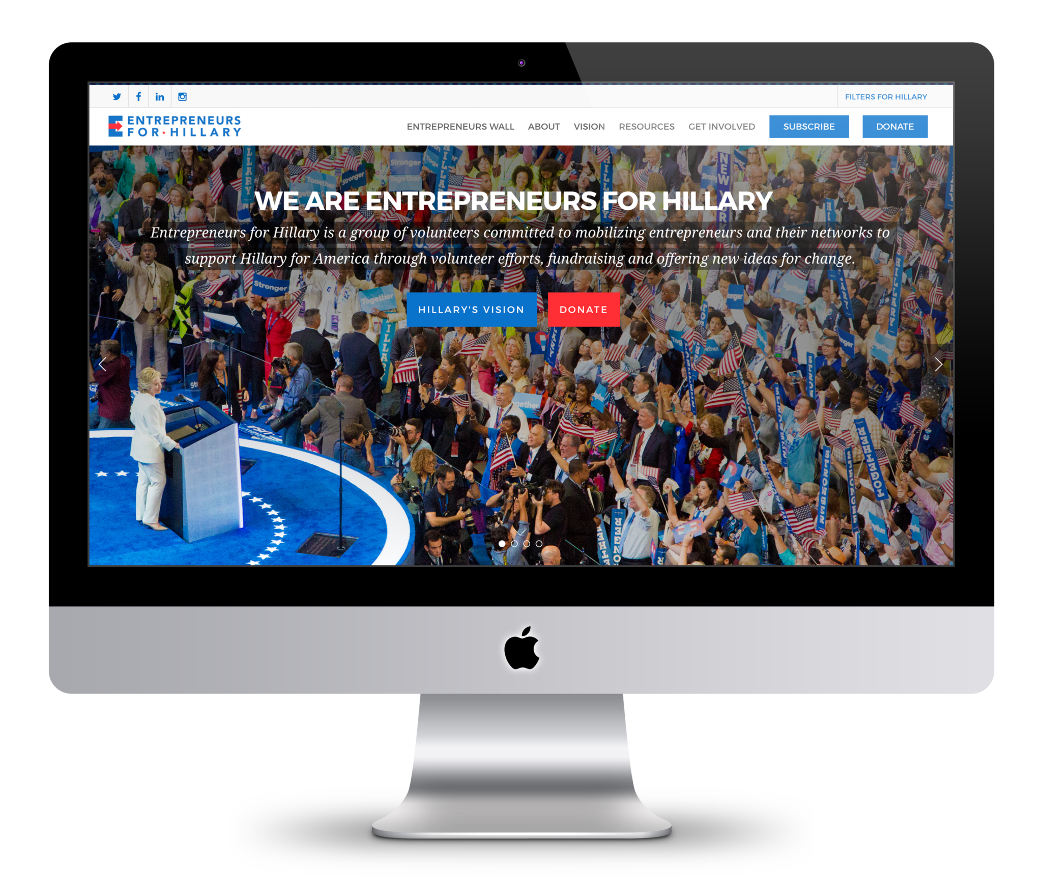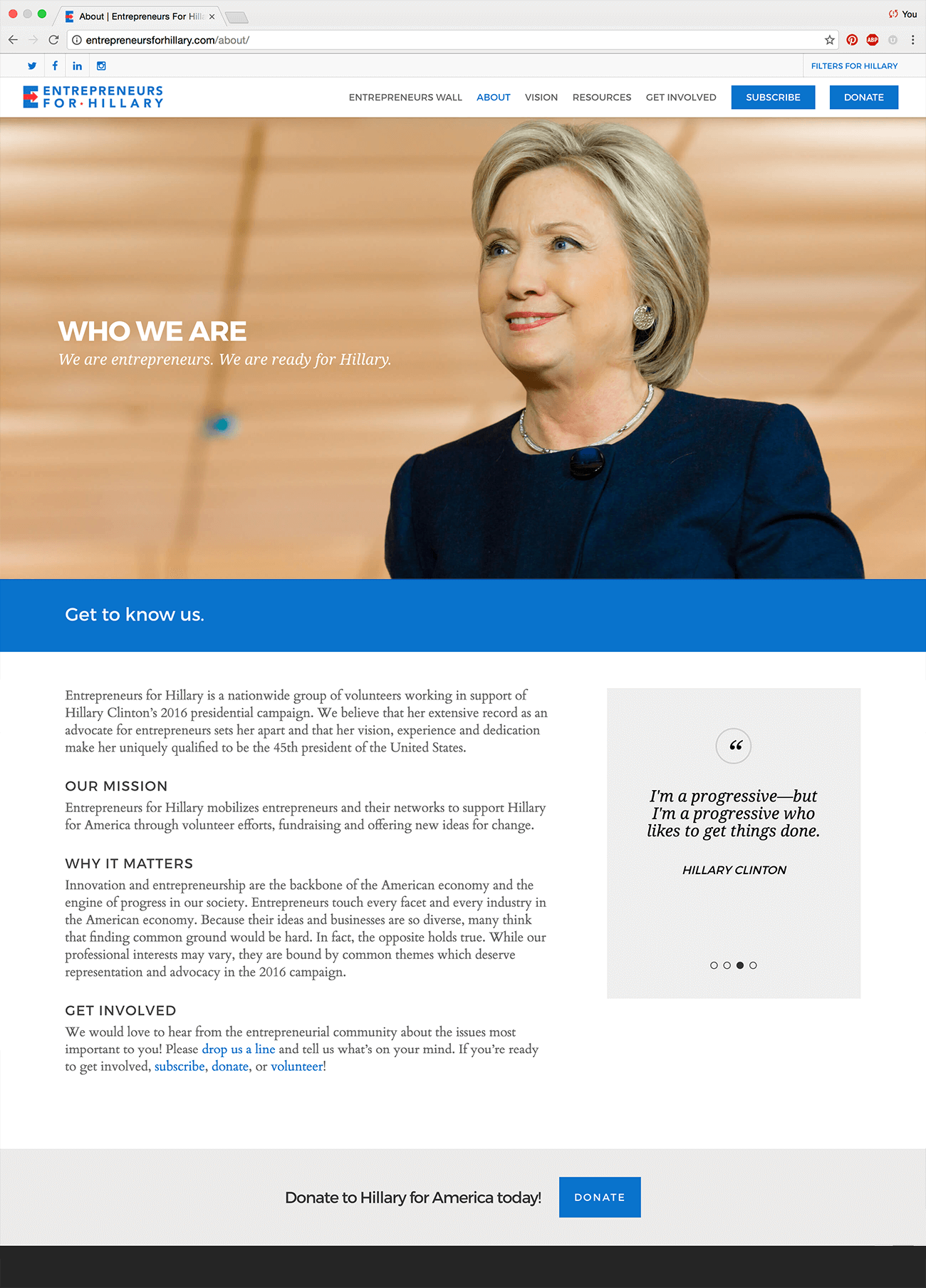 Entrepreneurs for Hillary was a fundraising organization that raised over $8 million for Hillary Clinton’s 2016 presidential campaign. As Lead Designer, I created a visual identity, website, social media graphics, and more for the organization to drive donations.