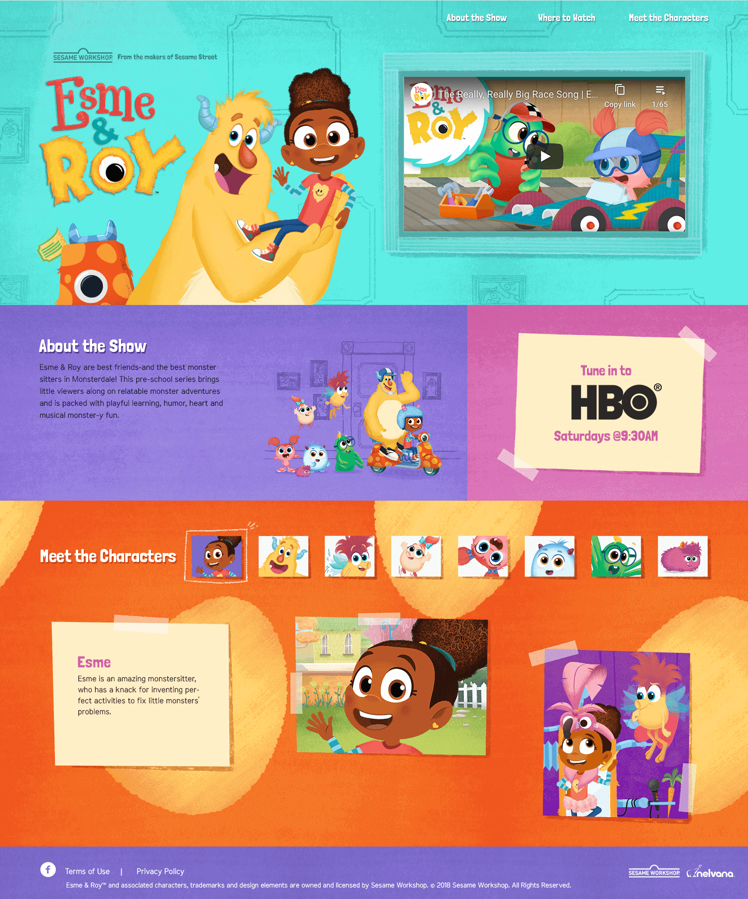 I designed a single-page microsite for Esme & Roy. The site presents basic information about the show and broadcast times, as well as character bios and an embedded Youtube playlist.